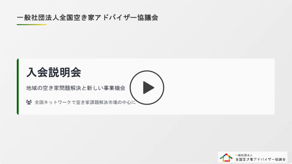 全国空き家アドバイザー協議会の活動にご興味のある方は入会説明会動画を是非ご覧ください。