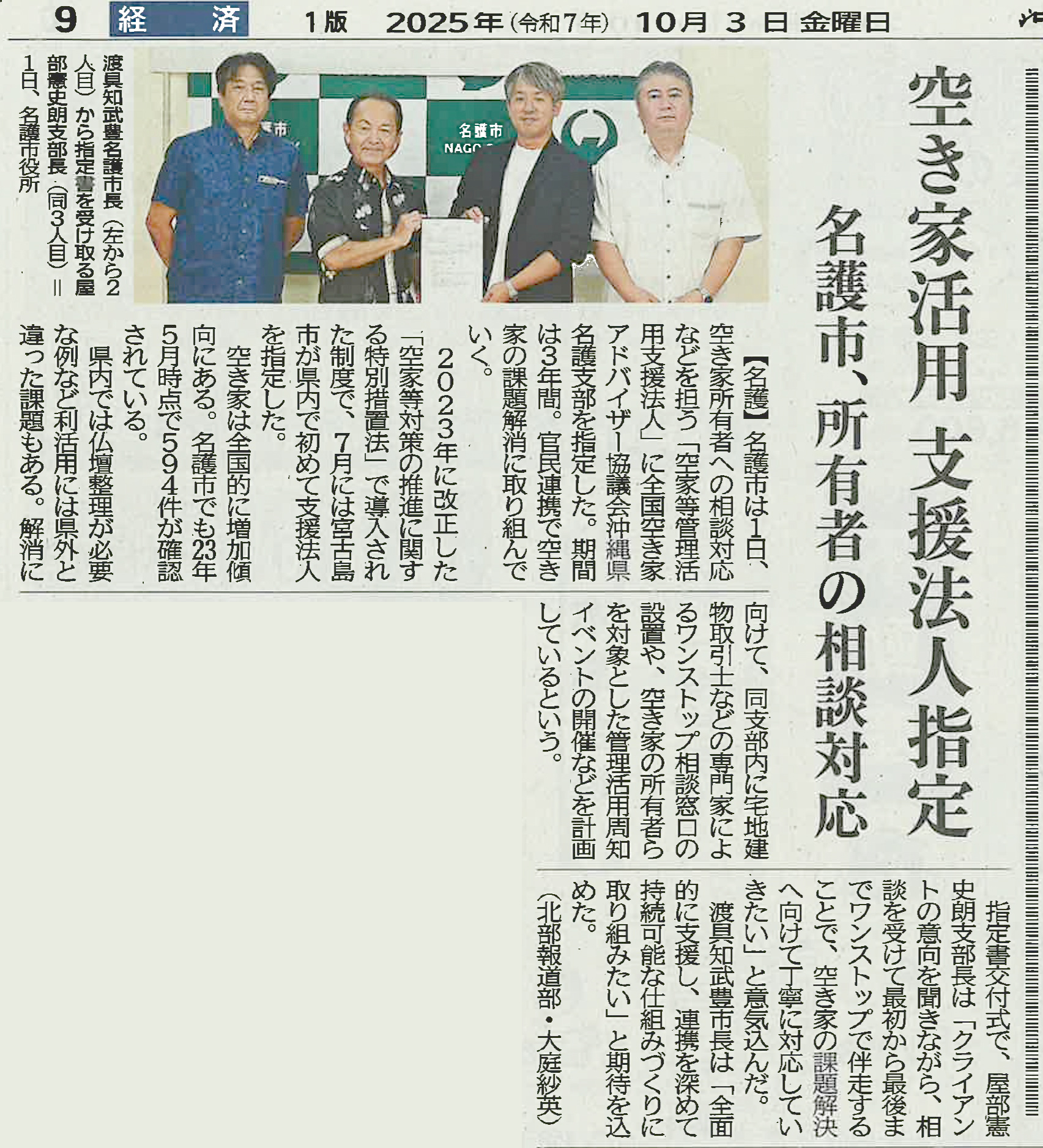 2025年10月3日沖縄タイムスに一般社団法人全国空き家アドバイザー協議会沖縄県名護支部が、沖縄県名護市から「空家等管理活動支援法人」に指定されたことが掲載されました。