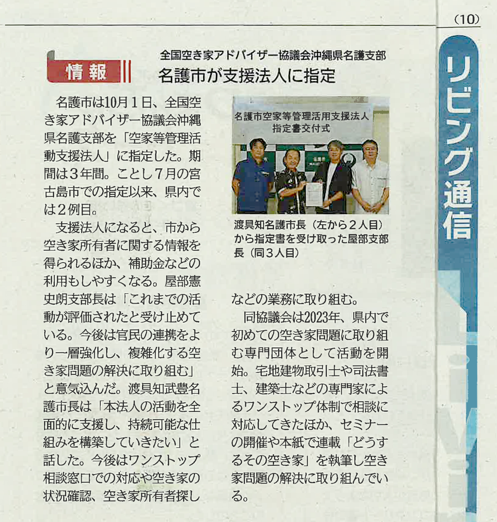 2025年10月週刊タイムス住宅新聞に沖縄県名護市が一般社団法人全国空き家アドバイザー協議会名護支部を「空家等管理活動支援法人」に指定したことについて掲載いただきました。