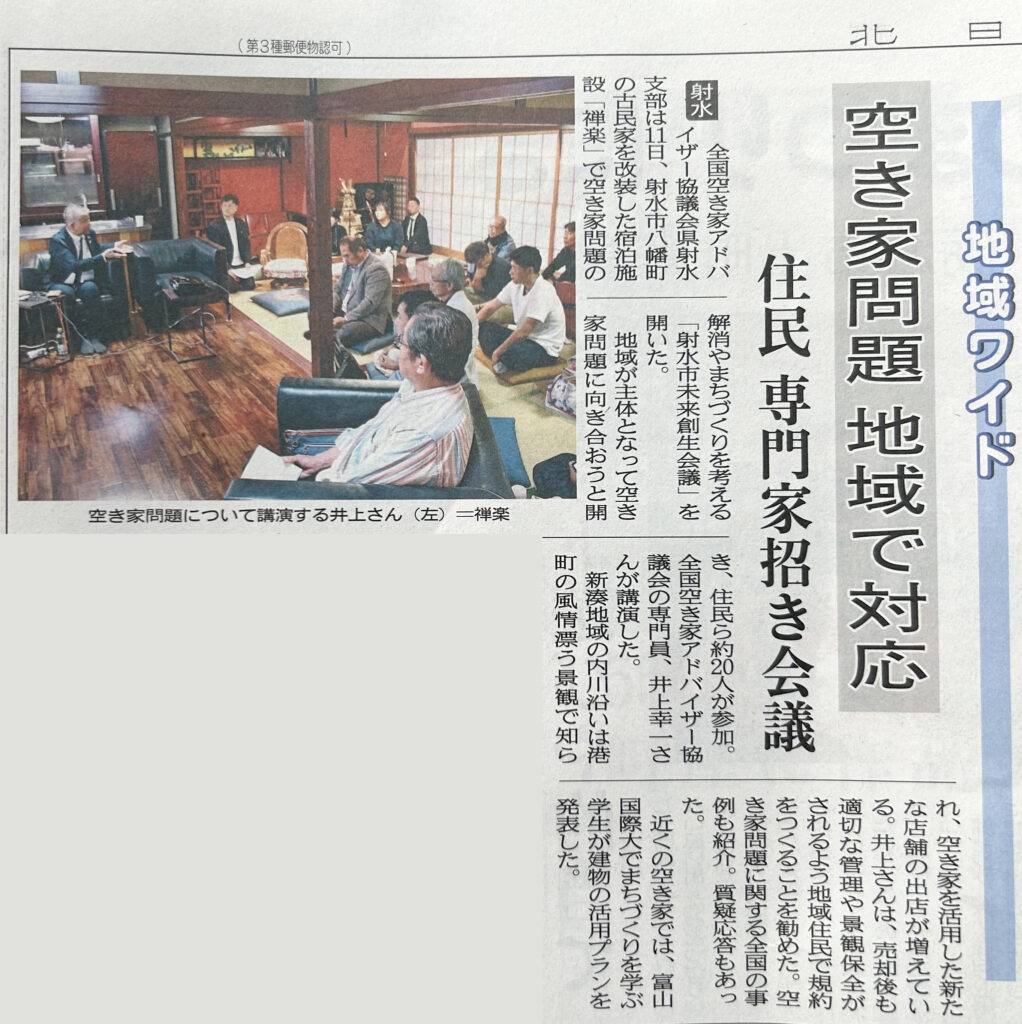 2025年10月12日の北日本新聞に、一般社団法人全国空き家アドバイザー協議会富山県射水支部が 全国空き家アドバイザー協議会専門員の井上幸一を迎え空き家対策の研修会を開いた事について掲載いただきました。