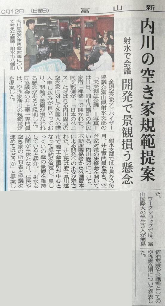 2025年10月12日の富山新聞に、一般社団法人全国空き家アドバイザー協議会富山県射水支部が 全国空き家アドバイザー協議会専門員の井上幸一を迎え空き家対策の研修会を開いた事について掲載いただきました。
