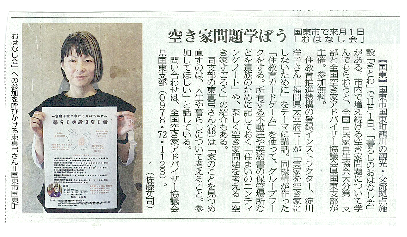 2025年10月27日の大分合同新聞に、一般社団法人全国空き家アドバイザー協議会大分県国東支部主催で11月1日に開催する