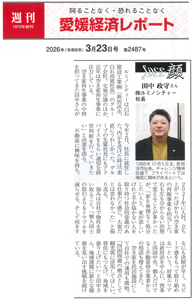 2026年3月23日号の愛媛経済レポートに、愛媛県新居浜支部 事務局長の田中氏の活動についてご紹介いただきました。