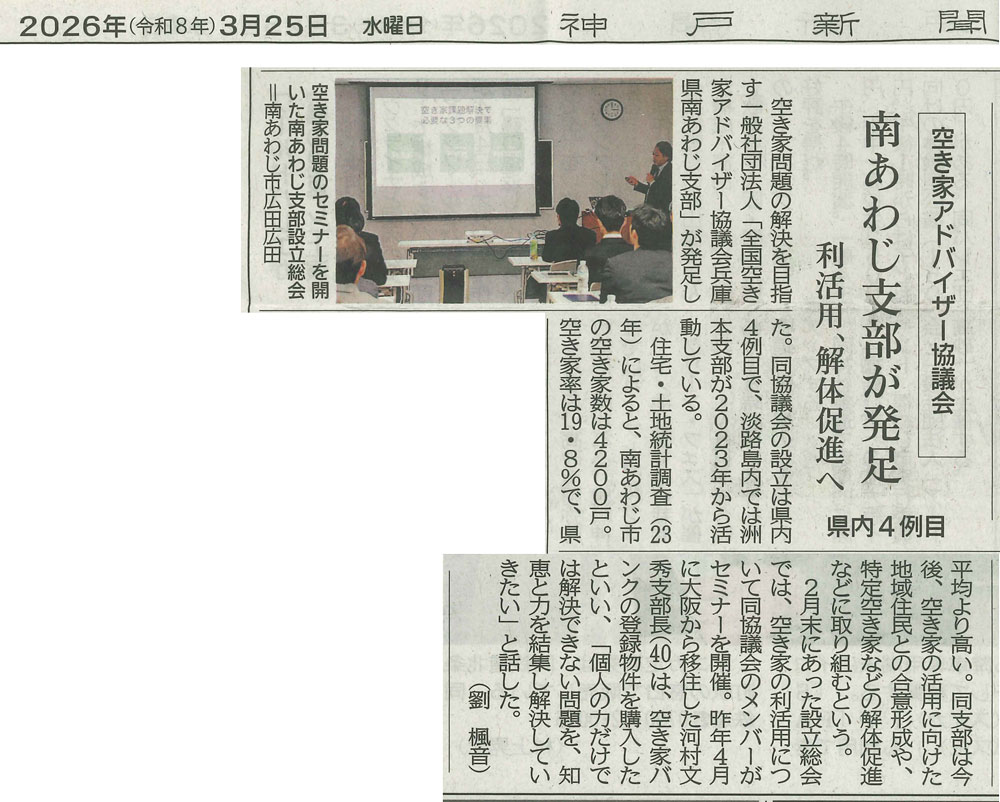 2026年3月25日の神戸新聞に、兵庫県南あわじ支部の設立について掲載いただきました。