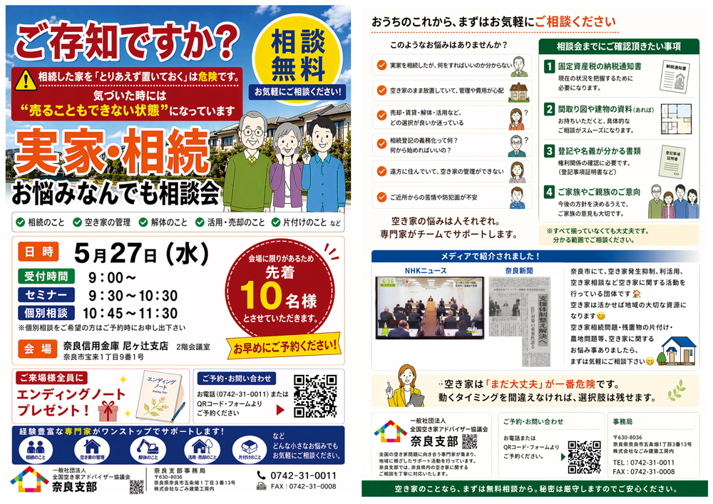 2026年5月27日(水)、奈良信用金庫 尼ヶ辻支店にて「実家・相続お悩みなんでも相談会」を開催します。